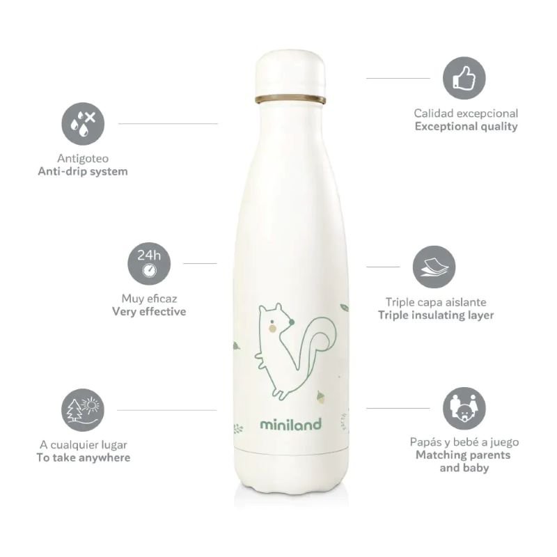 Les bouteilles thermos Miniland sont vraiment résistantes et effi caces grâce à leur double paroi en acier 18/8 (acier 304) et leur chambre à vide, elles gardent ainsi les liquides chauds ou froids tout au long de la journée.